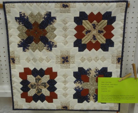 I also take pictures at the shows.  It was at a show in Franklin, IN a couple of years ago that I first saw the “Lucy Boston/Patchwork of the Crosses” pattern. I took a few pictures, and made a few of pieces with it. It has become a real favorite—though it is probably the most difficult one I do. It always gets a lot of comments at the shows.