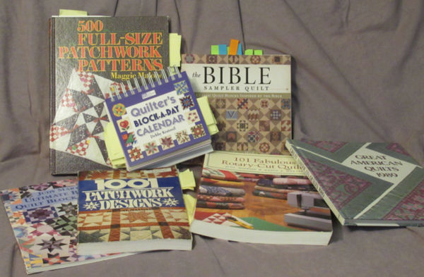 Now, if we go to a quilt shop, I will be more likely to buy a pattern book than she will. When we go to shows, I check out the local quilt guild’s table. Someone is always selling a book that might have a pattern I can use. That’s the least expensive source, believe me. I recently bought a book with 500 patterns in it. I paid ONE U.S. dollar for it.