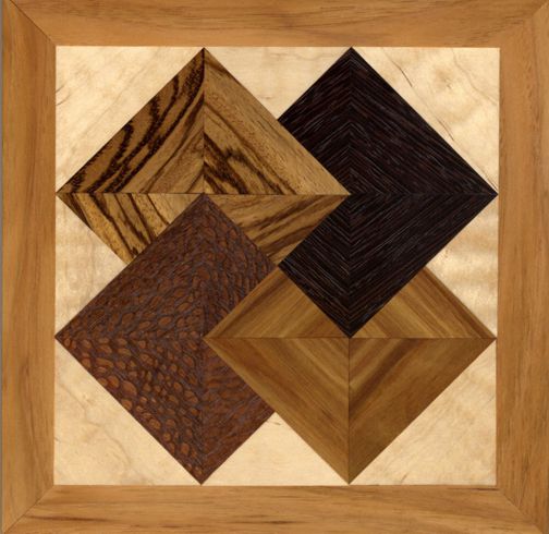 This Card Trick trivet contains not only native woods Pecan (the border) and Curly Maple (the white wood), but also imported exotics:  Zebrawood, Wenge. Leopardwood, and Canarywood.